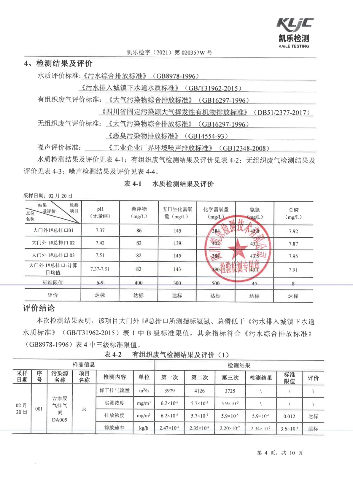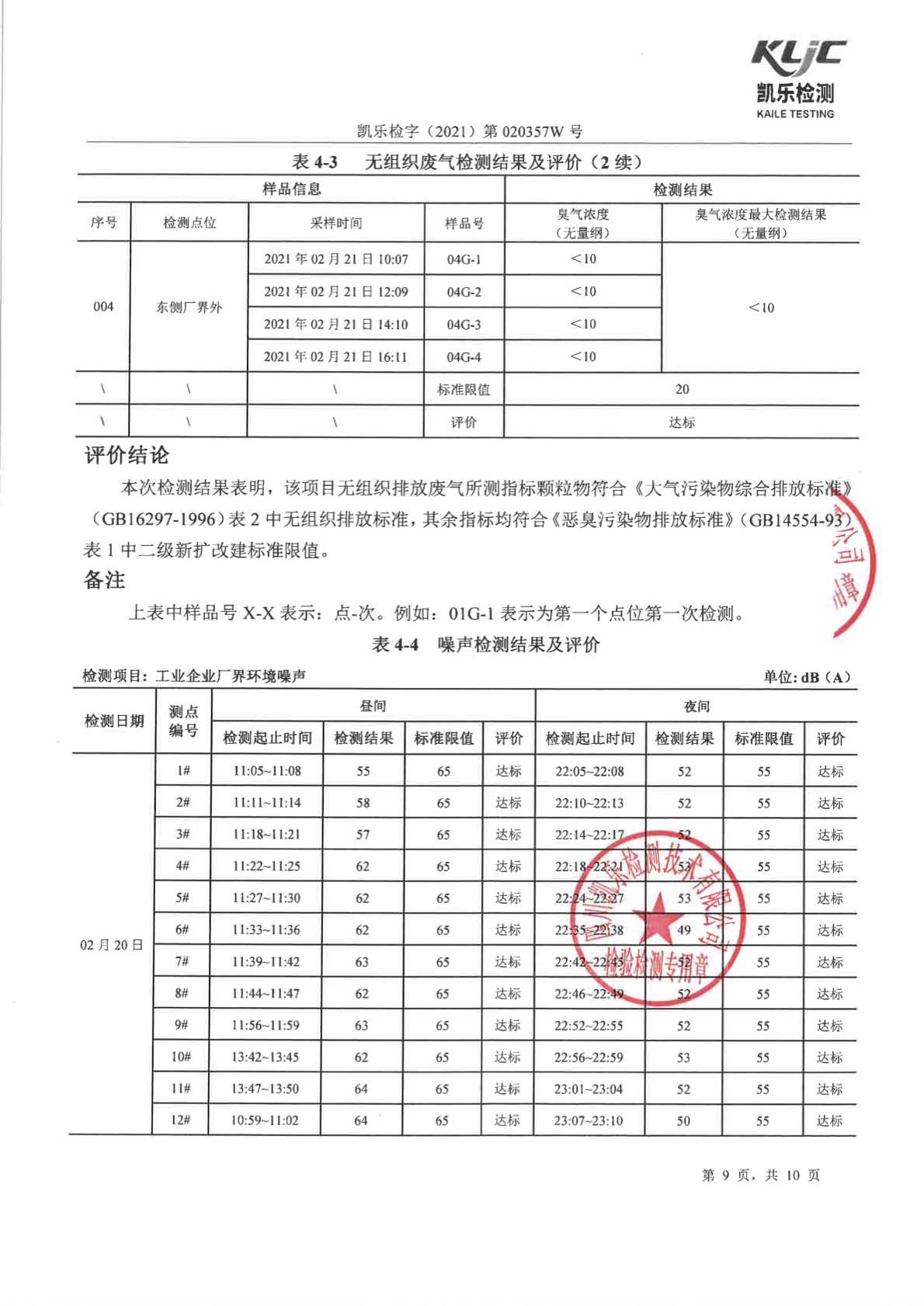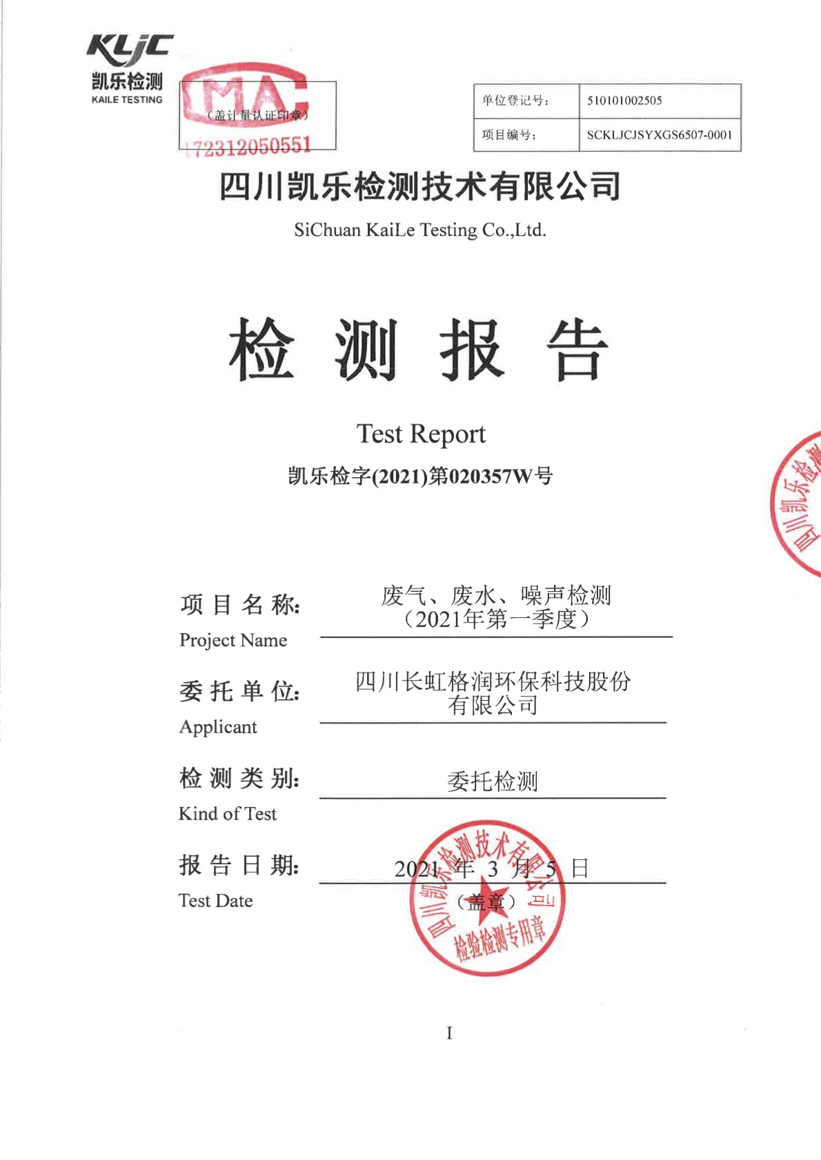 长虹格润第1季度检测报告 凯乐检字(2021)第020357W号