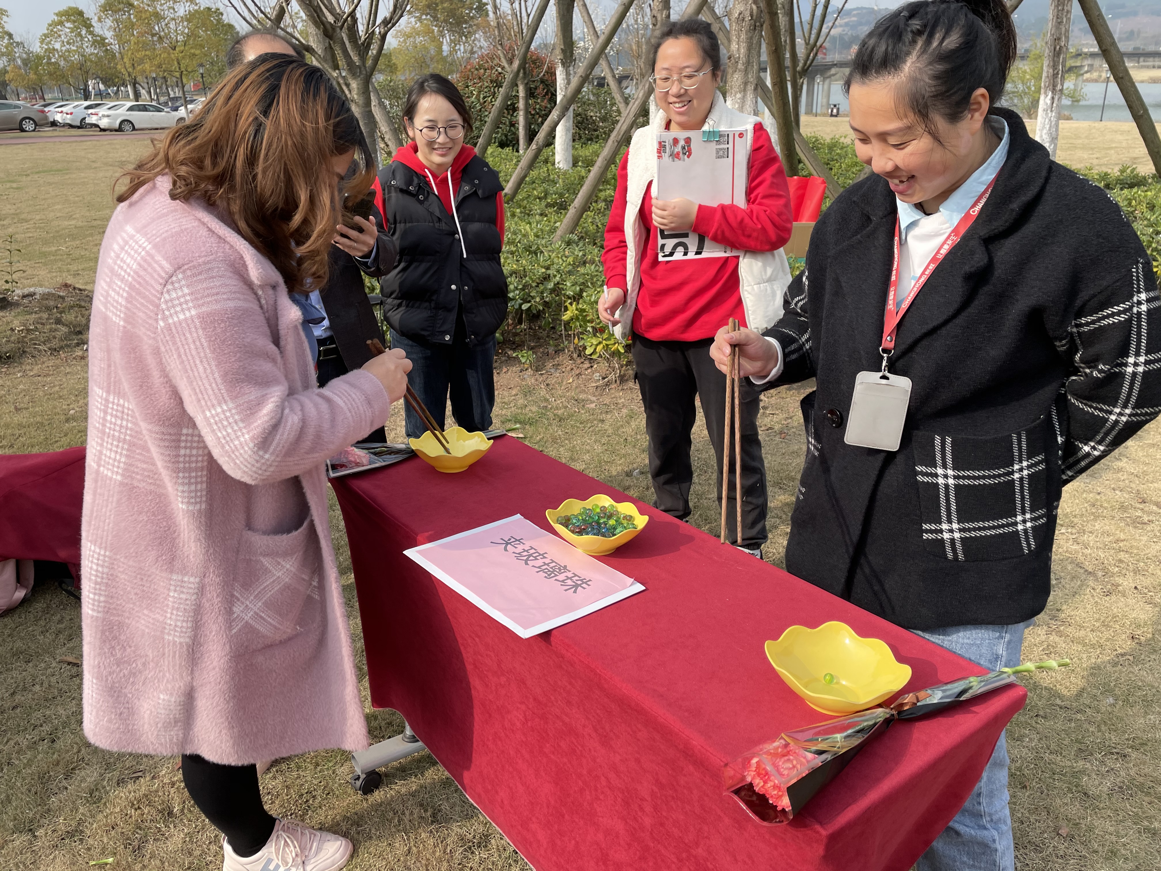 在“三八妇女节”室外活动现场,还准备了形式多样内容丰富的户外趣味活动,有夹弹珠、吹乒乓球、踢键子比赛。大家积极参与活动,玩得不亦乐乎,大家一起面对面交流、互动,分享着喜悦,共同享受节日的欢乐气氛。