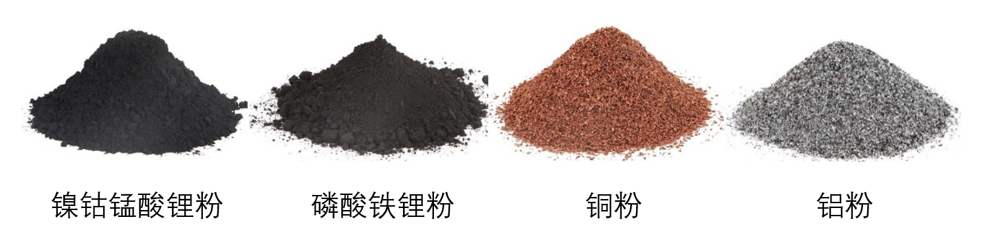 将这些废料进行提炼回收贵金属产物(镍钴锰酸锂粉、磷酸铁锂粉、铜粉、铝粉)。